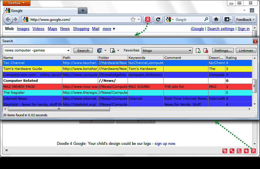 Linkman is a bookmark manager that efficiently organizes large numbers of bookmarks. Linkman directly integrates with Google Chrome, Firefox, Internet Explorer, Opera browsers, and supports many other browsers. Synchronizing bookmarks between different browsers and among computers is also possible. You get the choice to manage your bookmarks by keywords only, folders only, or folders and keywords. Linkman will extract keywords from web sites and update moved web addresses. The bookmark collection can be protected by a password. With a screenshot tutorial, an introduction video, and a comprehensive PDF manual, getting started has never been easier!